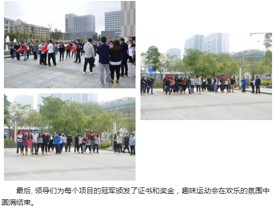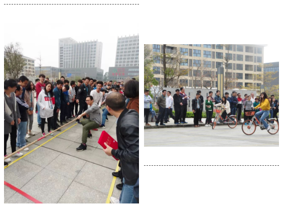 10点左右,运动会正式开始,所有员工分成六组比拼,拨河比赛分为淘汰赛和循环赛两轮进行,各组都派出了重量级选手,选手们斗志昂扬,裁判员还未宣布比赛开始,双方选手都已摆好阵势、弓满上弦,比赛开始后,选手们表现出了“力拔山河”的气概,未参加的组员都嘶声力竭为各白队友呐喊助威;6人7足比赛,各组选手经过赛前的短暂训练,讨论出应对战术,发挥了出色的团队协作能力;夹乒乓球接力比赛,选手们一边细心守护乒乓球,一边奋力奔跑与队友接力:懒情的自行车比赛是一场耐力与技巧的角逐,以自行车后轮液至终点线的时间来衡量成绩,时间长者胜出,参赛者单即触地、压线都视为犯规需罚时处理,让人既担心又揪心;穿衣接力比意,各组选手纷纷出课划策,从列队的间距、接力的姿势、脱穿的技巧等方面仔细分析制胜税诀...
