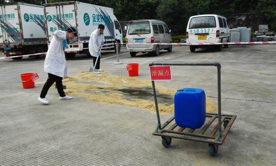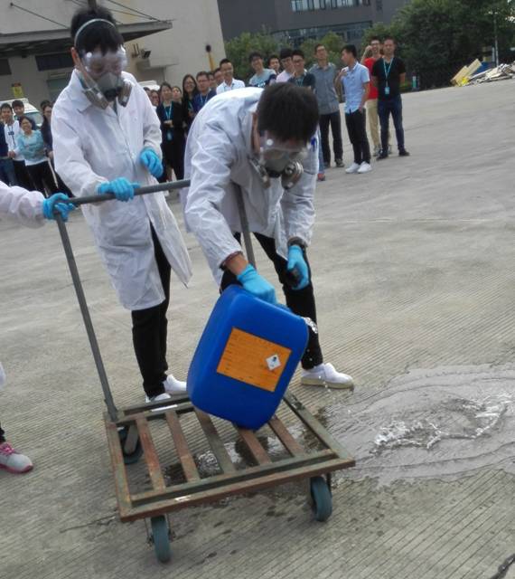 品泄漏事故应急演练 ,模拟剧毒化学品废液在转运中发生侧翻,出现小规模泄漏启动内部救援的应急处置。