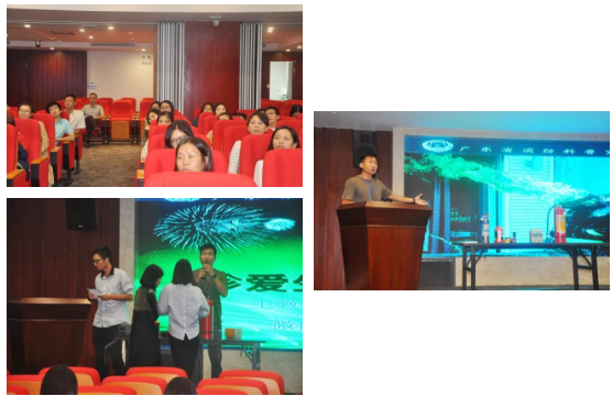 王教言首先从准备好的干粉灭火器和防每面具的使用作为切入点,紧接着播放某KTV因空气清新剂爆炸引起的火灾视频,引导我们认识到消防安全的重要性和掌理消防知识的必要性,接下来王教言围绕排插、手机充电器、电保险用的使用方法提出问题,先让大家思考和回答,再进行纠正和解答,随即总结出安全用电应注意以下几点:(1)整改乱播乱放的插空板(2)手机充完电记得拔充电器(3)做到人遗关电、人离拔电(4)遇到电器着火先断电后灭火。
